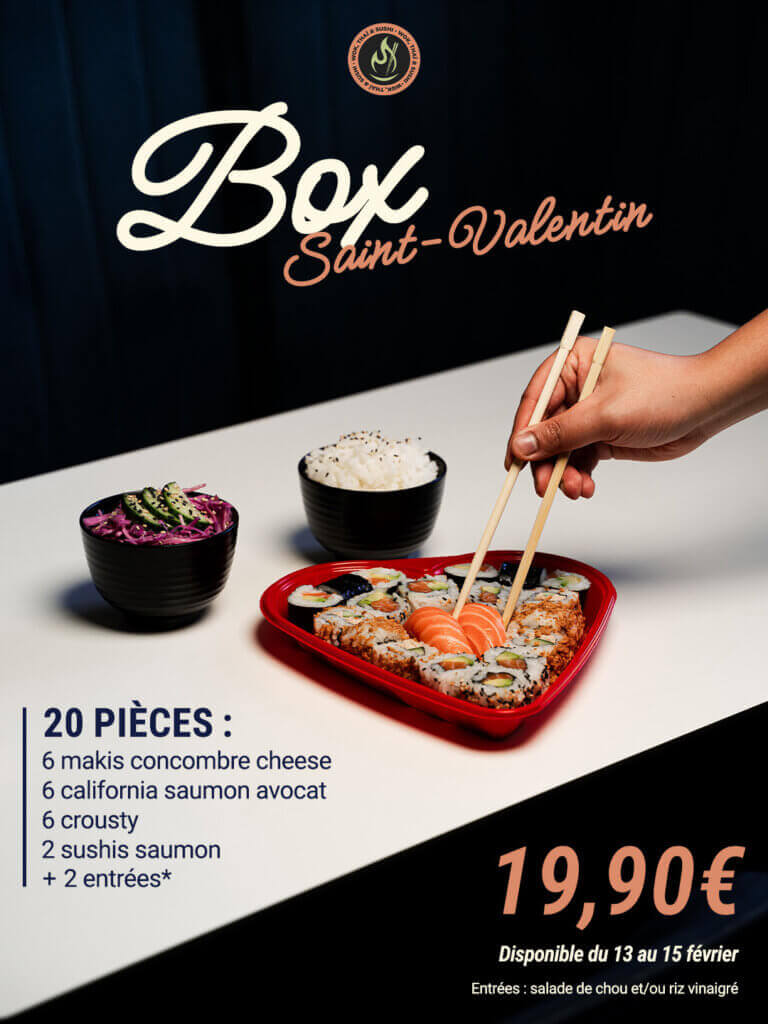 Célébrez l’amour avec notre box sushi Saint-Valentin en édition limitée. Pour seulement 19,90€, profitez d’un assortiment de 20 pièces gourmandes :